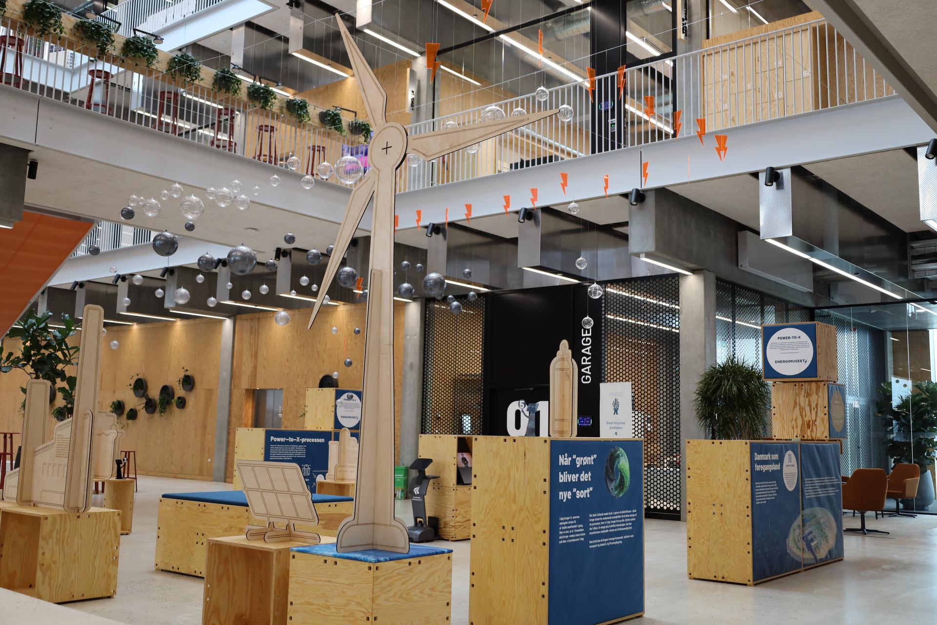 Det første der møder dig i stueetagen, midt i husets hjerte, er et udstillingsområde, hvor du kan få syn for sagen og, hvis indholdet tillader det, både se, høre og røre ved den nyeste forskning og innovation.